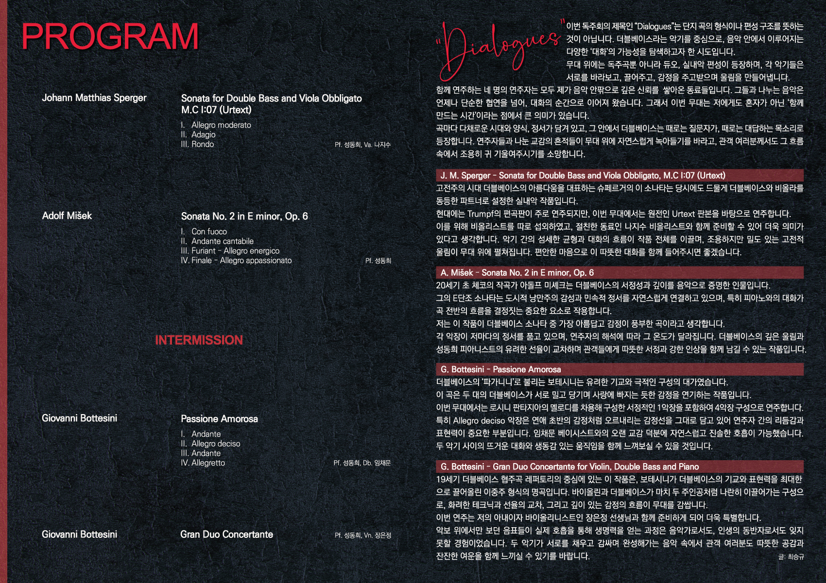 이번 최승규 더블베이스 독주회에서는 **스페르거(J.M. Sperger)**의 더블베이스와 비올라를 위한 소나타, **미셰크(A. Mišek)**의 소나타 2번, 그리고 더블베이스의 거장으로 불리는 **보테시니(G. Bottesini)**의 작품들이 연주됩니다. 특히 피아니스트 성동희, 비올리스트 나지수, 바이올리니스트 장은정, 그리고 더블베이시스트 임채곤이 협연자로 무대에 올라 풍성한 앙상블을 선사할 예정입니다.