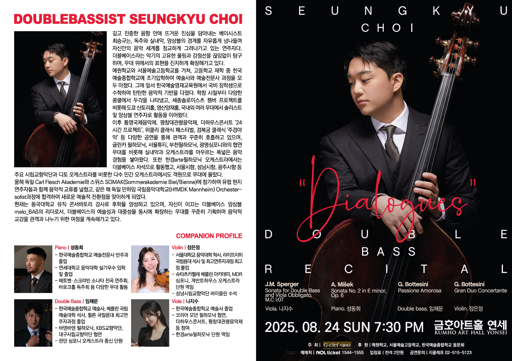 깊은 울림 속에 진심을 담아내는 더블베이시스트 최승규가 오는 2025년 8월 24일(일) 저녁 7시 30분, 서울 금호아트홀 연세에서 독주회를 개최합니다. 이번 공연의 주제는 **“Dialogues”**로, 더블베이스를 중심으로 네 명의 연주자가 함께 어우러져 음악적 대화를 펼치는 특별한 무대입니다.
